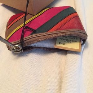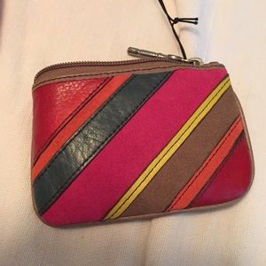Small tan wallet with colorful striping on the back. Never been used. Still in the package with tags.