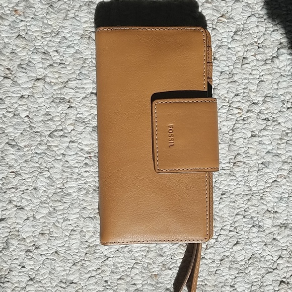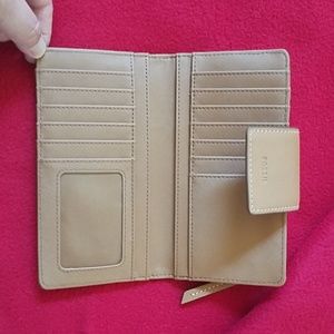 Like new tan fossil wallet with nice stitching contrast. It has 13 card slots. It is 7 inches across and 4 inches tall.