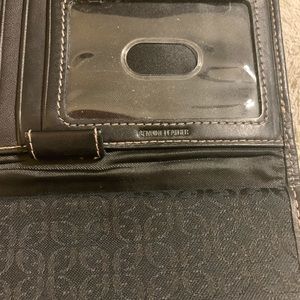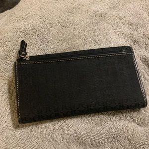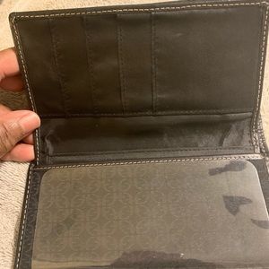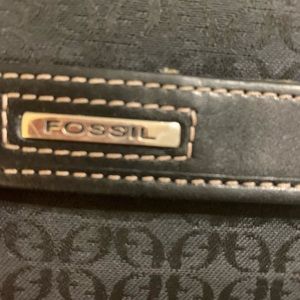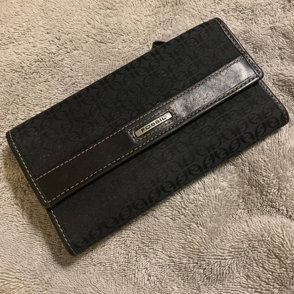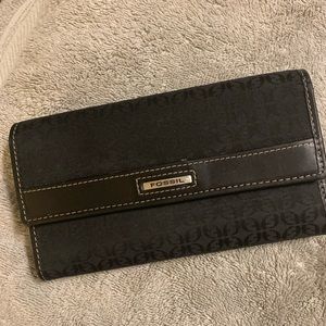 Female Fossil wallet!! Black in color. Trim in leather. Includes a checkbook cover/sleeve. Great wallet!!