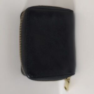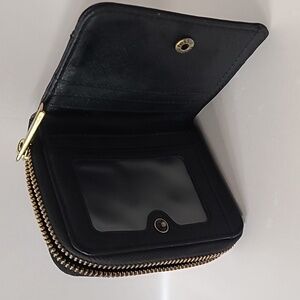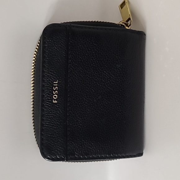 Women's black leather Fossil small wallet with ID window, 4 card slots, and zip around coin pocket. Wallet snaps close.