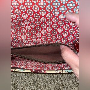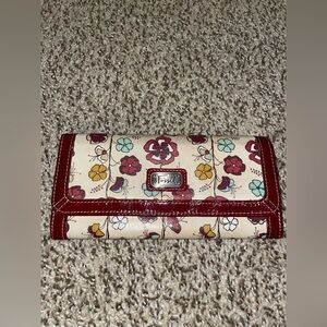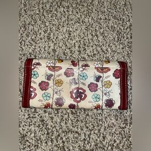 Used cute fossil flower wallet, with coin pocket, multiple card slots, 2 bill pockets. One corner has small wear which there is a picture of, other than that in good condition from a smoke free home
