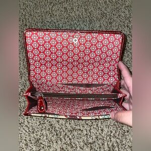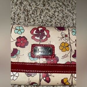 Used cute fossil flower wallet, with coin pocket, multiple card slots, 2 bill pockets. One corner has small wear which there is a picture of, other than that in good condition from a smoke free home