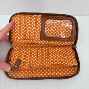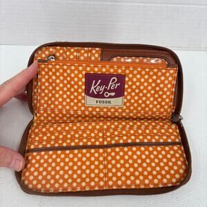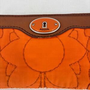 Fossil Wallet Clutch Orange Floral Quilted Nylon Brown Leather Zip Around
