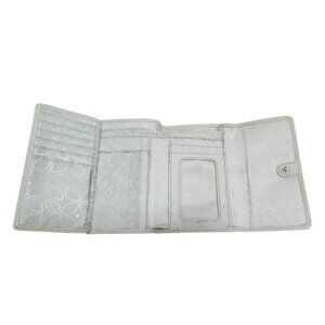 The Fossil white leather wallet for women features a zip-around style with credit card accents. Made of leather with a canvas fabric type, this one-size wallet is from the brand Fossil and is not vintage. It is a sleek and stylish accessory for women, perfect for keeping credit cards organized and secure in a convenient and fashionable wallet. Ideal for everyday use or special occasions, this wallet is a must-have for any woman looking for a high-quality and durable accessory.
