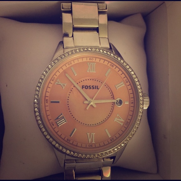 Silver fossil watch; pink on the inside with diamonds around it, barely worn.