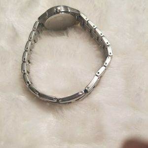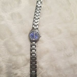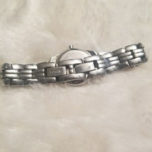 Silver Fossil watch with date shown on the Blue face. Silver band with a secure clasp. This item is used but in excellent condition and the battery is good.