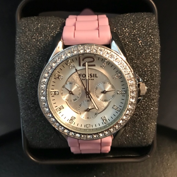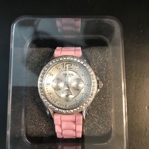 This Fossil Watch is Stunning. Silver with diamonds around the face with Pink band.