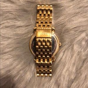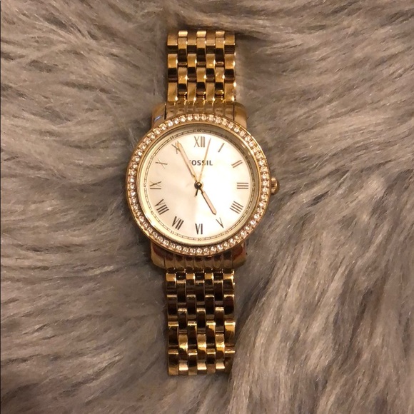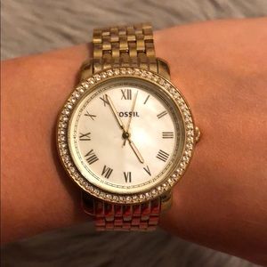 Fossil watch with pearlescent face surrounded by crystals. Gold band. Minor signs of wear. Small scratch in the face.