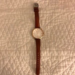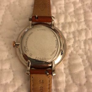 Fossil watch with gold Roman numerals border. Brown leather strap. Oversized face. Like new condition. Beautiful watch!