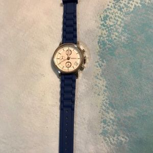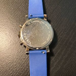Fossil Watch. Stainless steel 5 ATM ES-2202. Blue silicone wristband. Never worn but need batteries. (250911) Band can be changed. Still had plastic covering on the face so no scratches on facing. Only marks are ever so slight from keeping in the drawer on the back side. No Returns. Ask questions