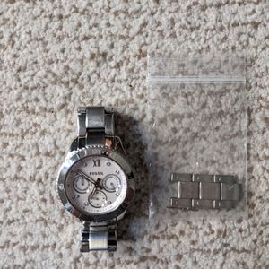 Fossil watch with some scuffing on the clasp. Comes with extra links. Needs new battery.