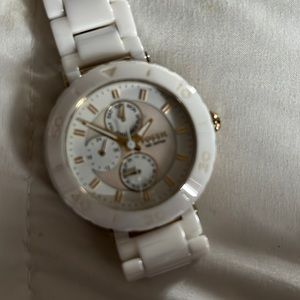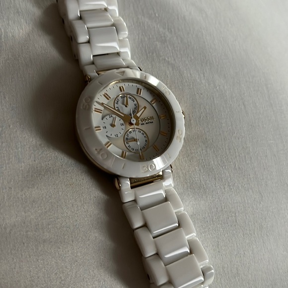 Ceramic white and gold with mother of pearl face, watch needs a battery