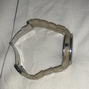 Fossil watch. White/cream acrylic band. Needs new battery! No scratches on the face but a few scratches on back of face where battery is inserted. No extra links