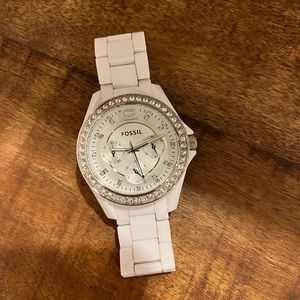 White enamel fossil watch with crystals