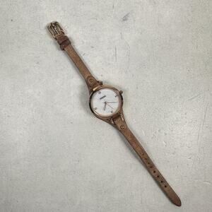 Band: Genuine leather strap in tan with matching rose gold-tone buckle; underside stamped "FOSSIL GENUINE LEATHER ES3157"