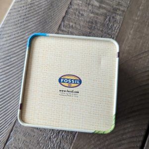 Beautiful women's two toned fossil watch with cubic zirconium surrounded face, analog and date on face. Links have been removed to make band smaller, would need to be a petite or child's wrist and needs battery. Comes with tin packaging.