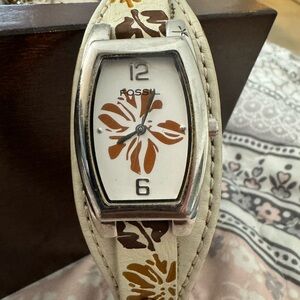 Elevate your style with this stunning Fossil wristwatch featuring a beautiful floral bezel on a silver stainless steel case. The two-piece leather strap adds a touch of casual elegance, perfect for any occasion. This vintage timepiece has a 12-hour analog display and a buckle closure for a comfortable fit.