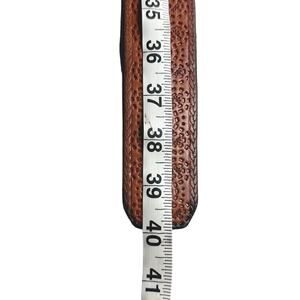 Pre-owned women’s Fossil brown leather belt featuring tooled and studded floral detail with a large brass buckle. Beautifully handcrafted with a rustic country western design.