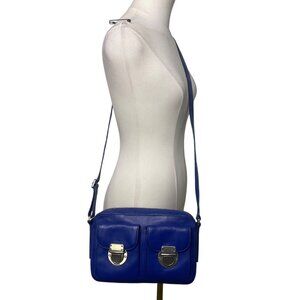 Vibrant blue leather crossbody bag with an adjustable strap, silver-tone hardware, and dual front snap pockets for secure storage.
