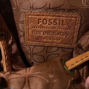 Fossil genuine leather backpack in rich brown. Features front flap closure with drawstring, dual front pockets with buckle detail, and adjustable back straps. Interior includes Fossil’s signature patterned lining with leather Fossil patch: “Long Live Vintage since 1954.”