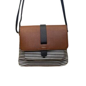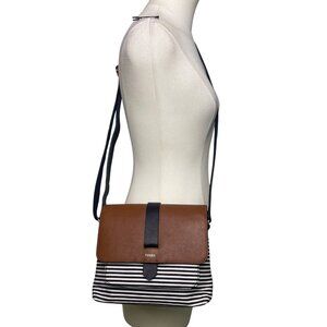 Fossil Women’s Brown Leather Black & White Striped Canvas Crossbody Bag