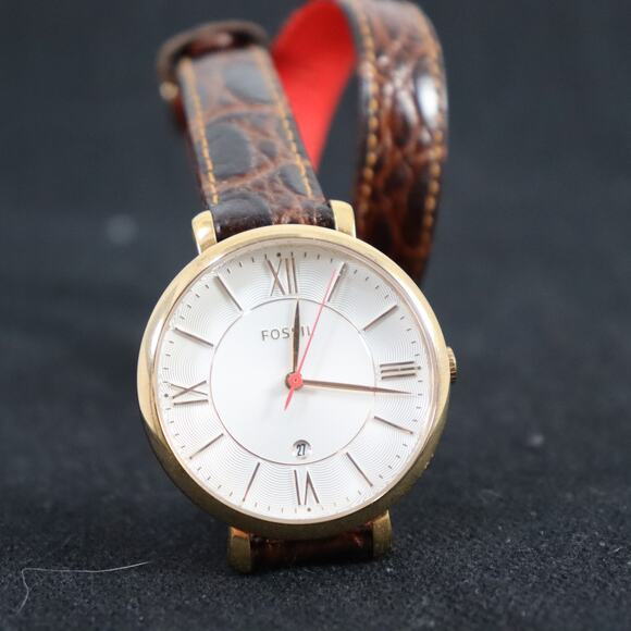 Classic Fossil women’s wristwatch with a gold-tone round case and white dial featuring Roman numeral markers, red seconds hand, and date display. Comes with a textured brown leather strap and gold Fossil buckle.