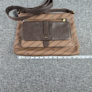 This Fossil Women's Kinley Crossbody Bag ZB1643 in Two Tone Brown Diagonal is a stylish and versatile accessory perfect for various occasions. Made of leather with gold hardware accents, this medium-sized rectangular bag features a crossbody strap handle in brown, making it easy to carry on the go. With a zip and magnetic closure, inner pockets, and an adjustable strap, this designer bag exudes a bohemian yet classic vibe, ideal for casual, business, or party settings. The exterior and lining in shades of brown add a touch of sophistication to any outfit, making it a must-have fashion piece for women on the move. Only faws are shown near the bag straps, otherwise excellent condition