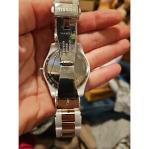 The product is a Fossil women's wristwatch with a pink dial and bezel, featuring a pink and white link band. It has a quartz movement and an analog display.