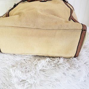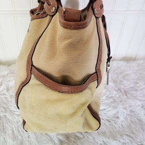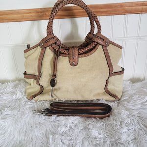 Fossil Womens Satchel Brown Fabric & Leather Braid Handles Key Charm Modern Vtg