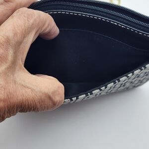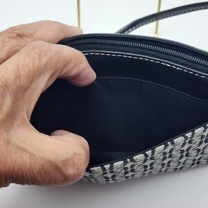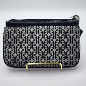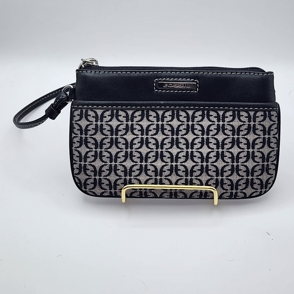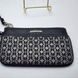 This is like new, EUC Fossil wristlet, featuring a black and gray signature canvas design with leather trim. It has a zip-around closure and a pocket in front and back. It includes an attached keychain.