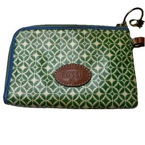 Fossil Wristlet Wallet PVC Coated Canvas Zip Around Green Blue Diamond print
