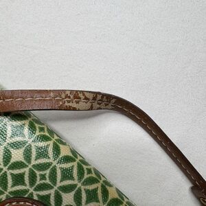 Fossil Wristlet Wallet PVC Coated Canvas Zip Around Green Blue Diamond print. Yellow linings. Some discoloration on the interior. Peeling on the strap please see photos. Approx measurements 6 x 4