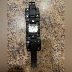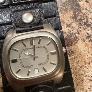 Watch face is rectangular, and shows the brand name ("Fossil"), with no numbers, just the hour spaces marked with lines.