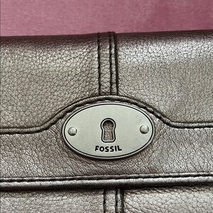 Chic Fossil wallet in metallic gunmetal silver leather with silver hardware. Features Fossiles signature key lock on the front, has two different closure snaps to expand the size capacity. Stylish and functional for everyday use.