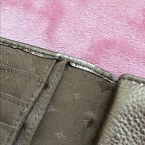Call outs: small tear by one card slot that does not affect the use or overall appearance of the wallet , see photos for reference