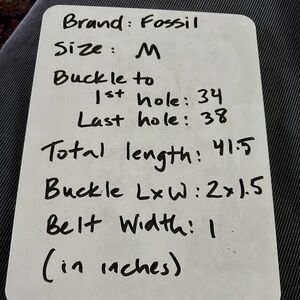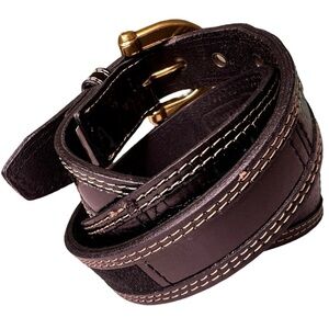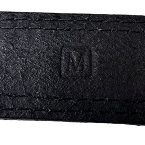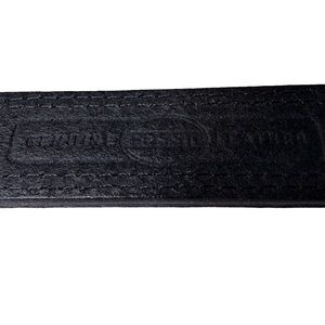 This belt has a patchwork design featuring patent leather, leather and suede black sections. Contrasting white thread. Gold tone buckle and holes. Excellent condition.
