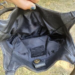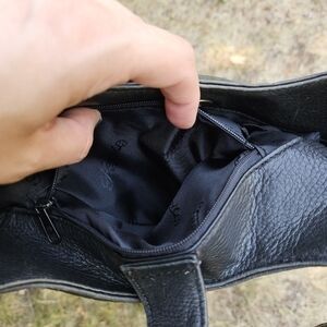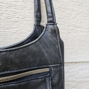 Black leather purse, almost like a mini tote. Has two shoulder straps. On one side there is a zippered pocket and a magnetic flap pocket. Main compartment has magnetic closure. Leather has some fading, and hardware shows signs of wear. In structurally good shape.
