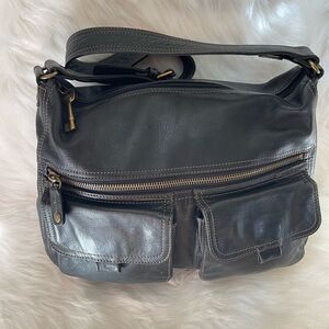 Fossil black soft leather shoulder with antique tone hardwares adjustable strap.front zipper two front pockets with magnetic closure back pocket with magnetic closure top zipper the inside lining has a side zipper and two side pockets pre owned in good used condition normal wear see all pictures any questions please message.F6