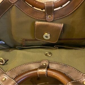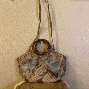 Fossil handbag dark Hawaiian tropical palm print wooden handles or strap
