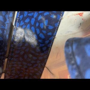 Fossil key Per multi color zigzag coated canvas ltote with blue & brown trim back zipper compartment magnetic closure the inside has a side zipper two side pockets pre owned in good used condition some ink spots on the inside lining no tear see all pictures any questions please message G5