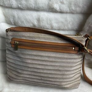 Fossil kinley Cotton stripes beige and taupe leather tan trims crossbody bag.