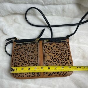Fossil leather calf hair cheetah prints & tan pebble leather crossbody body bag black strap.two front zipper pockets top zipper the inside lining has a side zipper a side pocket six cards pockets. Pre owned in good used condition signs of wear on the calf hair the inside lining has some ink stains see all pictures any questions please message.