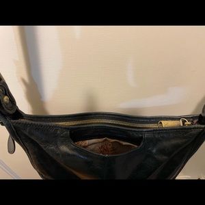 Leather with fabric lining cross body handbag. 2 tiny spots on leathers, see close up pics. Lots of pockets inside and out. Can adjust 45 inch strap.