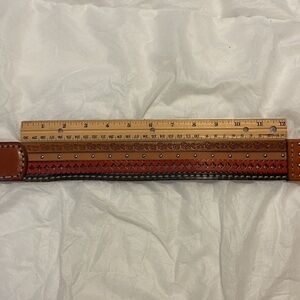 The length of the leather portion of the belt is approximately 39.5 inches. The length of the buckle is approximately 1.75 inches