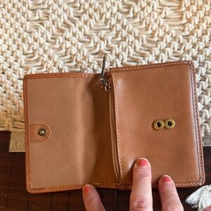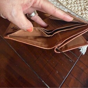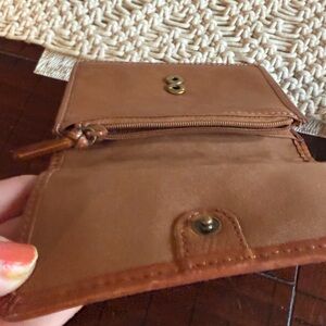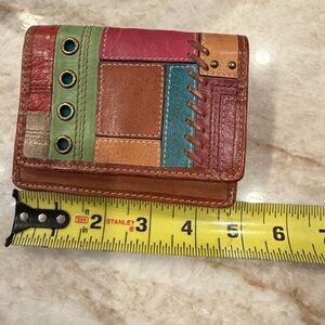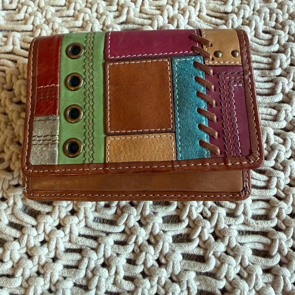 Fossil patchwork leather tri-fold wallet featuring multi-colored embossed suede, decorative stitching, and brass-tone eyelets.
