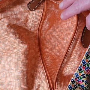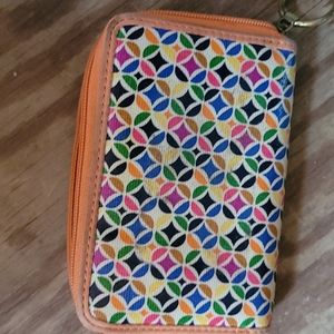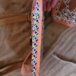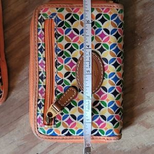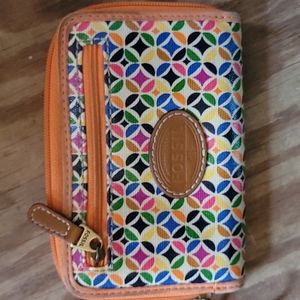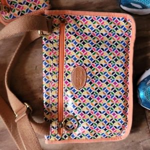 Excellent condition, 2 piece set. Fossil bag with adjustable strap and matching wallet. please see pics for size. made of coated cotton Non-smoking home.