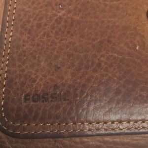 Brown leather fossil wallet. Wallet has 7 card slots, ID slot 5 bill/receipt slips ( one clear) and pen holder. Slip pocket on front and zipper coin purse on back  Also has checkbook cover insert that has 2 slips that can be used for bills, receipts or coupons and 4 additional card slots. Fold over snap closure Bundle for a discount