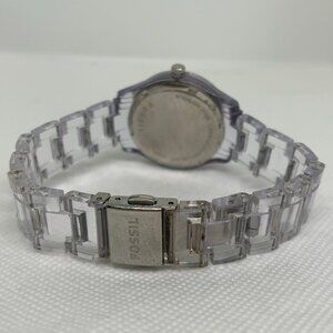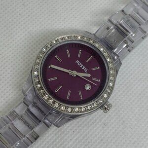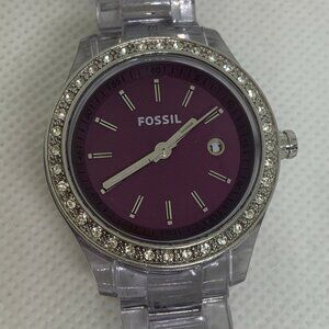 Fossil women date watch ES-2611 purple dial 30mm round case quartz analog rhinestones, clear adjustable links bracelet size up to 7.5” , in good condition battery installed