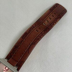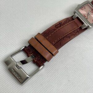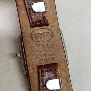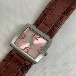 Fossil women watch JR-9878 silver tone square case 27mm pink dial quartz analog brown wide leather band , in good condition battery installed