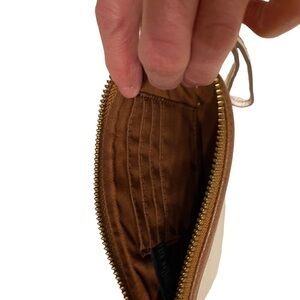 Cream with brown color block. Exterior leather interior fabric card holder inside. 7 1/2” x 5”. Strap is 6 inches in length gold toned zipper in excellent condition no marks, scratches, stains, or flaws.